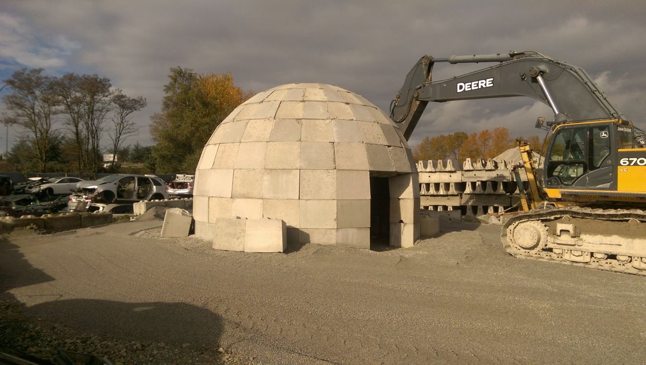 Lock-Block Ltd. has developed a modular system that can be used to construct domes in a very short time.  Since the structures are solid concrete, they can provide excellent insulation and weather shelter for either storage or habitation.
